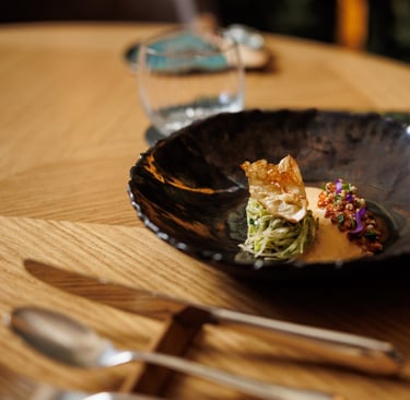 Situated beneath the historic castle, within Platán Manor, the décor is elegant yet unobtrusive. Barrel-vaulted ceilings of the cellar, exposed stone, and polished wood surfaces create a timeless atmosphere that feels both grand and home‑grown. Soft lighting and tasteful furnishings extend the sense of refined comfort. The transitions between spaces—lakeside welcome room to vaulted cellar salon—enhance the narrative rhythm of the evening. Each environment frames the food, reinforcing the connection between history, nature, and fine dining artistry without luxury overwhelming simplicity.